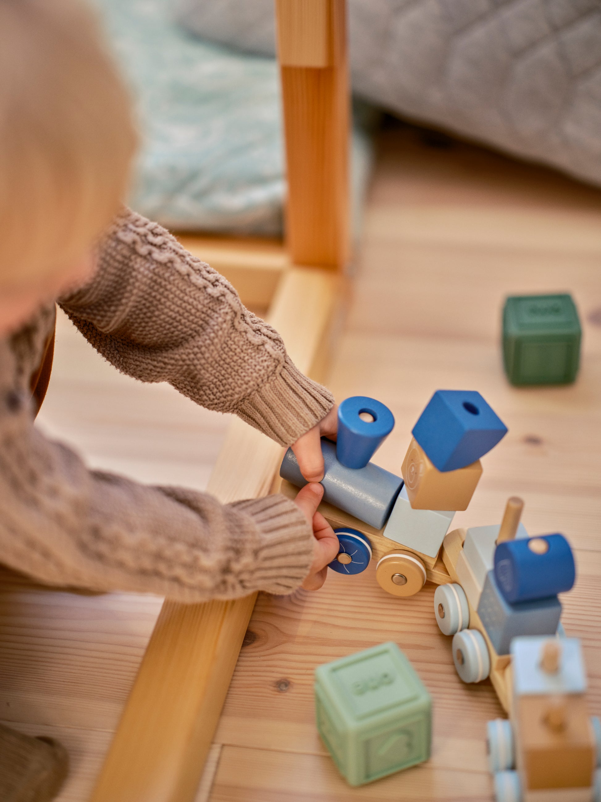 Take play to the next level with the Blue Brick Train from Moovertoys. Constructed from FSC-certified wood, this train comes with blocks that kids can stack and arrange as they drive the train around. The toy is both educational and entertaining, stimulating fine motor skills, creativity and logical thinking. The child-safe, non-toxic colors make it a safe choice for little hands.